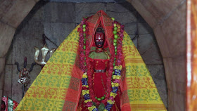 The deity of Devi Tripura Sundari is made of Kasti stone which is rosy dark in variety. The idol is 1.57 meters tall. installed on a stone platform, it is 1.64 meters in length and width. Devi Tripura Sundari stands on Lord Siva's chest and is crowned with a golden crown and has a gridlock. She has four hands, a face that is a little longer, and relatively small eyes.